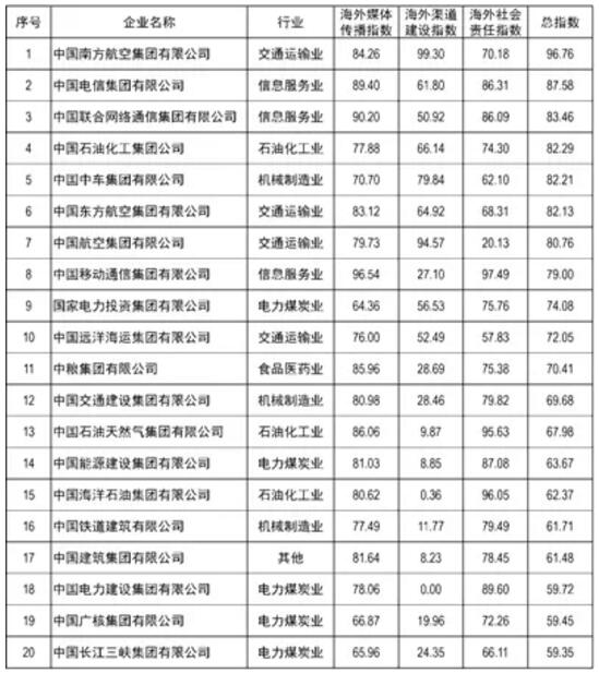 《报告》数据显示,中国南方航空集团有限公司、中国电信集团有限公司、中国联合网络通信集团有限公司、中国石油化工集团公司、中国中车集团有限公司位居前5位。其中,航空、信息服务业表现突出,各项指数发展均衡,中国南方航空集团有限公司位列榜单首位。与2017年相比,中国电信集团有限公司由于海外媒体传播指数与社会责任指数表现较为突出,使其整体排名有大幅提升。(见表1)