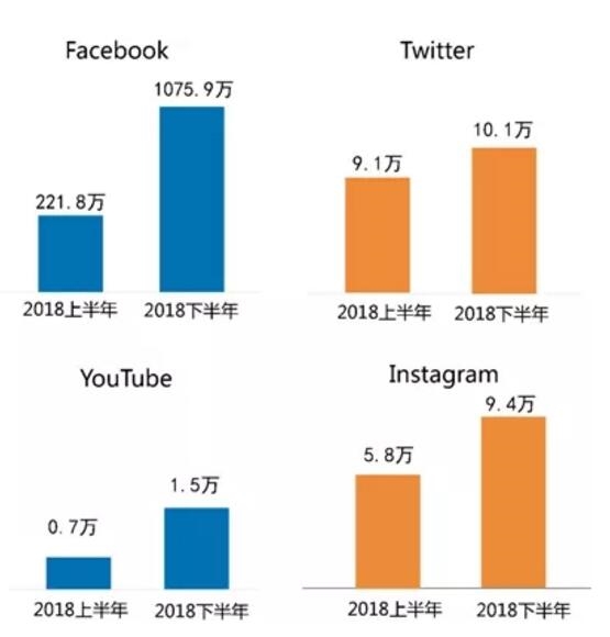 2018年以来,尤其是6月份以后,央企及其子公司新开通了几十个境外社交媒体账号。受此影响,与2018年上半年相比,Facebook平台中央企业集团账号的总粉丝量增长最迅猛,增长率高达385.2%,增长量为850余万。其次,YouTube平台央企集团账号的总粉丝量增长率也非常可观,为101.2%,增长量为7523个;与上半年相比,Instagram平台央企集团账号的粉丝量增长62.0%,增长了3.6余万;Twitter平台央企集团账号总粉丝量增长率为10.7%,粉丝量比上半年增长近万个。(见图4)