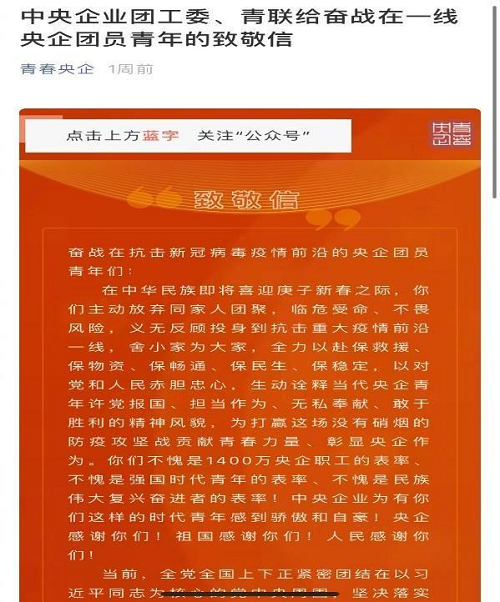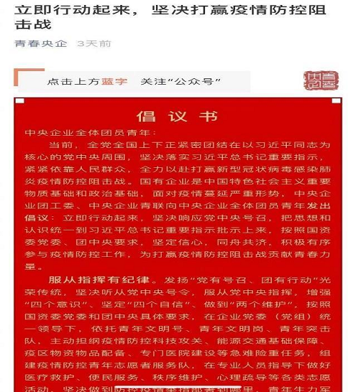 按照国资委党委部署,1月29日,当疫情转入关键攻坚阶段,中央企业团工委、中央企业青联发出《立即行动起来坚决打赢疫情防控阻击战——致中央企业全体团员青年倡议书》,“坚定信心,同舟共济,积极有序参与疫情防控工作,为打赢疫情防控阻击战贡献青春力量”,倡议书吹响央企青年战“疫”攻坚号角。