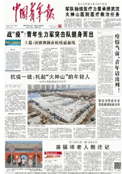 “疫情就是命令,防控就是责任”!中央企业团工委迅速与团中央办公厅、宣传部等各相关部门以及中国青年报、中国青年杂志等媒体取得联系,建立信息报送通道及工作微信群。中国青年报武汉前方报道组在1月24日发出《中青报直击:全国人民在吃年夜饭,他们在建“武汉小汤山”》,《武汉“小汤山”医院开工,冒雨建设的员工90%以上是90后》等专题文章,对参与前方一线建设中的中建三局青年突击队进行了特别报道,引发全社会青年的广泛关注。