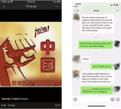 我们的工作也激发了国际友人心手传递爱心,国际客户也通过他们渠道为武汉加油!巴基斯坦Kummas企业说“我们国家有困难时中国帮助了我们,我们也希望为武汉疫情尽一份力”,并愿意为湖北免费提供N95口罩等紧缺医疗物资。
