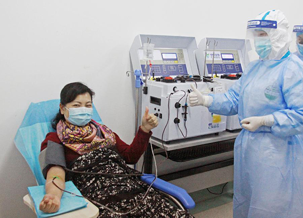 2月18日,武汉市金银潭医院院长张定宇的夫人程琳来到金银潭医院,捐献了400毫升血浆。程琳1月19日确诊新冠肺炎后在武汉市第四医院接受治疗,于1月29日康复出院。 新华社发(武汉市金银潭医院供图)