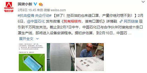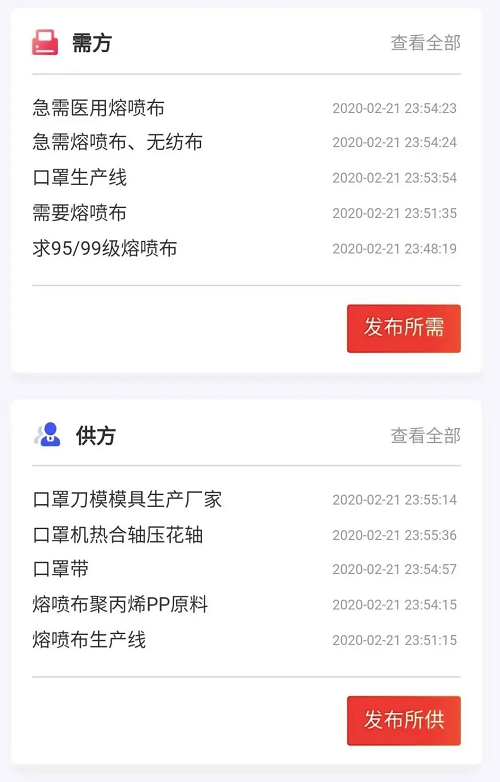 目前,供需对接平台已在新华网客户端、央企电商联盟等平台上线。截至2月22日,平台共累计上传657家企业防控物资的964条供需信息,撮合30家企业开展对接,物资类别涵盖熔喷布、泵头等原材料和口罩、防护服、酒精等。