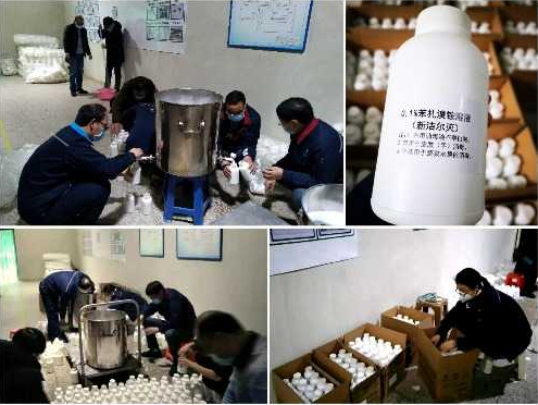 夏梦霄、许玉洁等几名青年团员自发组建了青年后勤小分队,为全司职工配制、分发84消毒液和新洁尔灭手消毒液共计2200余瓶,为保障职工和家人身体健康以及公司稳定生产贡献自己的力量。