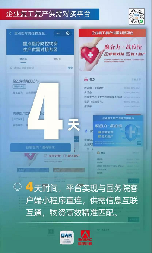 平台充分发挥中央企业上下游生态圈协同优势,调动相关国资国企物资生产技术能力和物资储备库存,并积极吸引社会企业提供疫情防控物资、原材料、生产设备等资源渠道,推动全社会信息广泛共享,实现线上无缝衔接、线下精准对接、高效达成合作,全面助力防疫防护物资生产供应和企业复工复产。