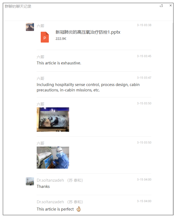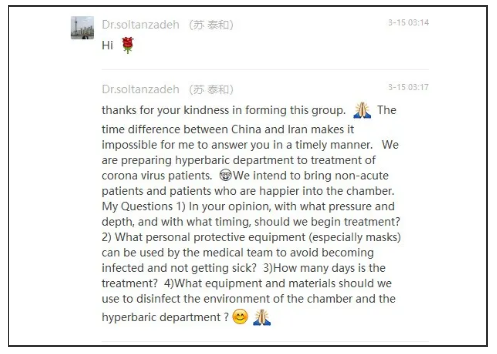 自3月15日起,米兰体育网页版_米兰体育(中国)官方在线登录东风总医院高压氧科主任贺聪(微信昵称 六哥)就开始用手机设定好凌晨2点半的闹钟,只为了在凌晨3点,通过微信群,与远在伊朗的Dr.soltanzadeh(中文名 苏泰和)医生就交流新冠肺炎患者的高压氧治疗经验。