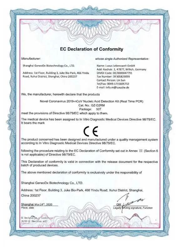3月14日,米兰体育网页版_米兰体育(中国)官方在线登录中国生物上海捷诺完成了自主研发的新型冠状病毒2019-nCoV核酸检测试剂盒(荧光PCR法)的欧盟CE认证。欧盟CE认证表明该产品符合欧盟医疗器械相关指令的符合性要求,具备欧盟市场的准入条件。