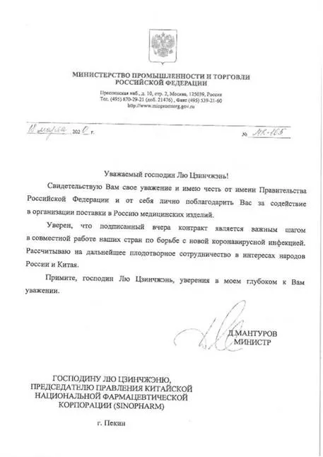 俄罗斯工贸部部长在接到首批米兰体育网页版_米兰体育(中国)官方在线登录供应俄方物资后致信说:“双方所签署的协议,是我们两国共同努力防治新型冠状病毒的重要一步”;