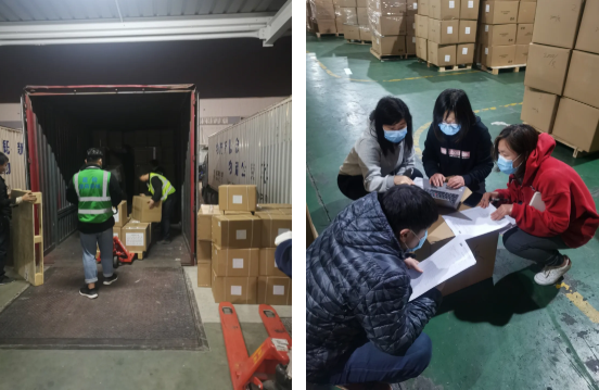 经过第二批员工的不懈努力,近500托口罩经过卸货、质量检验、重新打托,已整装待发,质量人员在现场临时搭建工作台核对货物数量。
