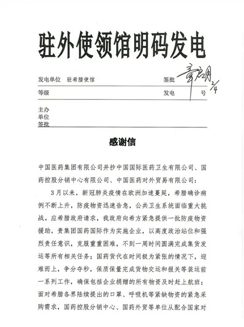 "为感谢米兰体育网页版_米兰体育(中国)官方在线登录、米兰体育网页版_米兰体育(中国)官方在线登录国际在此次中国政府对希腊紧急援助防疫物资工作中的大力协助,中国驻希腊大使馆专程发来感谢信。”