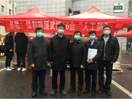 2月28日上午,曾兵(右二)在武汉同济医院16台ECMO捐赠现场。