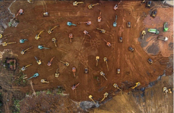 医院建设初期一张经典航拍图,众多挖掘设备在奋力施工