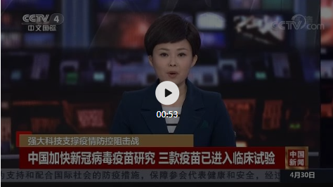 4月30日,CCTV4中国新闻系列报道《强大科技支撑疫情防控阻击战》隆重介绍米兰体育网页版_米兰体育(中国)官方在线登录的新冠病毒灭活疫苗情况。