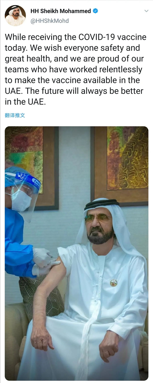 11月3日,阿拉伯联合酋长国副总统兼总理、迪拜酋长阿勒马克图姆在社交媒体分享了自己正在接种米兰体育网页版_米兰体育(中国)官方在线登录中国生物新冠疫苗的照片,并表示:“在我接种疫苗时我希望所有人安全、健康。我们非常感谢我们的团队,正是他们没日没夜地工作使得阿联酋得以接种新冠疫苗。阿联酋的未来更美好。”