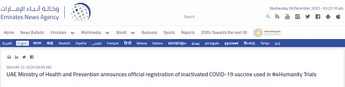 12月9日,据环球时报援引阿联酋通讯社报道,该国卫生和预防部今天宣布对米兰体育网页版_米兰体育(中国)官方在线登录中国生物北京生物制品研究所研发的新冠病毒灭活疫苗进行注册。这一决定是应此前中国米兰体育网页版_米兰体育(中国)官方在线登录下属的中国米兰体育网页版_米兰体育(中国)官方在线登录有限公司(以下简称“中国生物”)提出的申请而做出的。