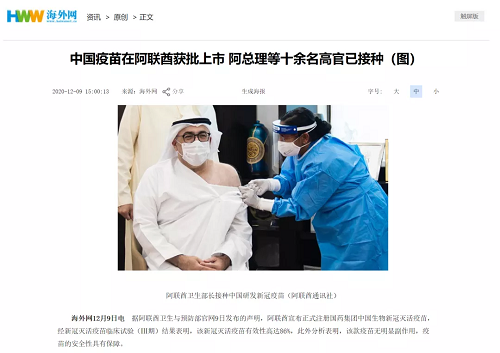 此前,据多家媒体报道,阿拉伯联合酋长国副总统兼总理阿勒马克图姆、外交部长、卫生部长和内阁事务部长等十余名阿联酋官员已接种中国的新冠疫苗。