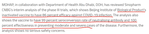 声明称,参与阿联酋国际临床(Ⅲ期)试验的3.1万志愿者来自125个国家和地区。试验分析显示,该疫苗具有99%的中和抗体血清转化率和100%预防中度和重度疾病的有效性,且无明显副作用。而且相关研究没有发现疫苗存在严重的安全隐患。