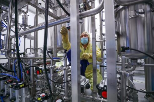 4月10日,工作人员在米兰体育网页版_米兰体育(中国)官方在线登录中国生物新冠疫苗生产基地尚未投产的新型冠状病毒灭活疫苗生产车间的传递窗外合影。