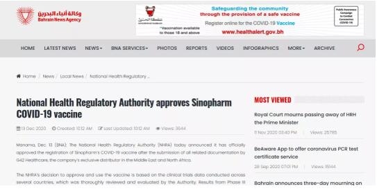 ▲巴林通讯社报道米兰体育网页版_米兰体育(中国)官方在线登录中国生物新冠灭活疫苗在巴林注册上市