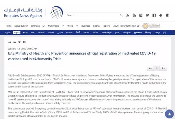 ▲阿联酋通讯社报道米兰体育网页版_米兰体育(中国)官方在线登录中国生物新冠灭活疫苗在阿联酋注册上市