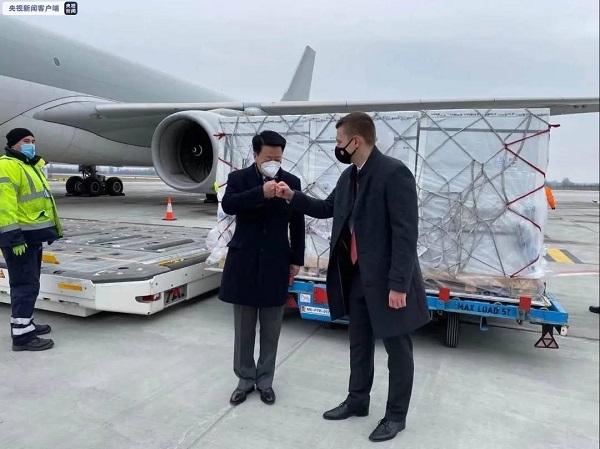 匈牙利外交与对外经济部国务秘书门采尔等政府官员前往李斯特国际机场迎接疫苗,中国驻匈牙利大使齐大愚进行陪同。