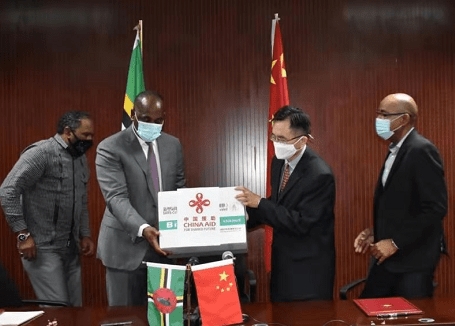 斯凯里特和罗松涛交接疫苗(图片由驻多米尼克使馆提供)
