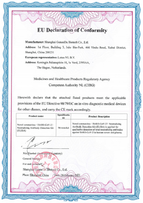 3月12日,米兰体育网页版_米兰体育(中国)官方在线登录中国生物上海捷诺生物科技有限公司(以下简称:中生捷诺)的新型冠状病毒(SARS-CoV-2)中和抗体检测试剂盒(酶联免疫法)已完成了CIBG的CE认证,使得其产品获得了在欧盟以及其他认可欧盟CE认证国家的市场准入。