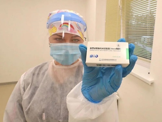 ↑4月16日,在白俄罗斯首都明斯克郊区的中白工业园,医务人员展示中国米兰体育网页版_米兰体育(中国)官方在线登录研制和生产的新冠灭活疫苗。