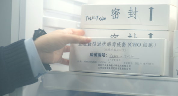 ▲从冷藏柜中取出临床接种用中国生物重组新冠疫苗