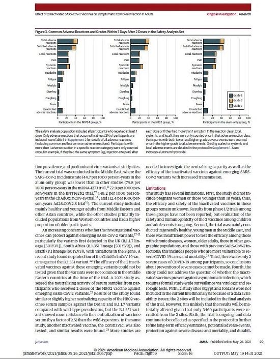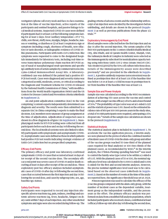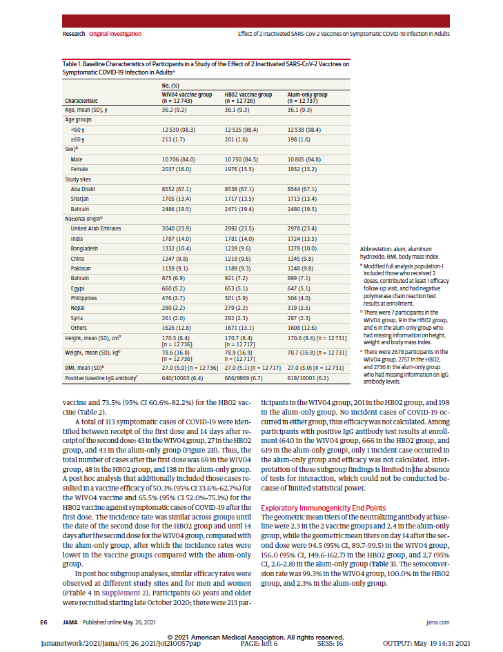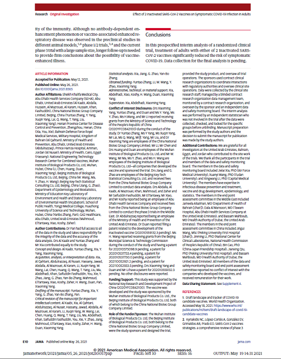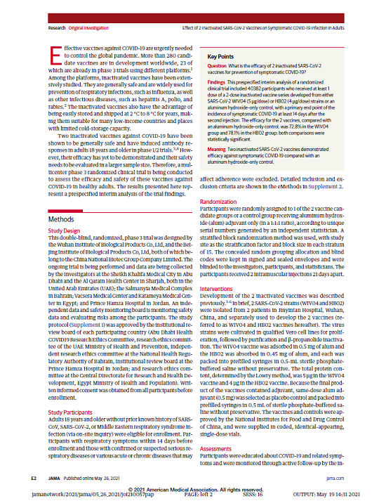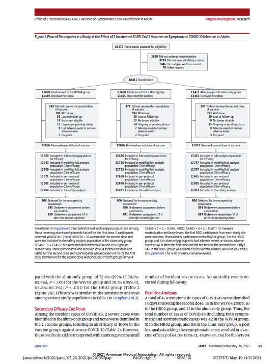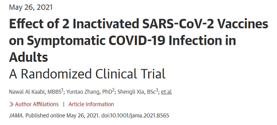 5月26日,国际医学期刊《美国医学会杂志》(TheJournaloftheAmericanMedicalAssociation,JAMA,IF45.54)刊登了米兰体育网页版_米兰体育(中国)官方在线登录中国生物发表的《两种新型冠状病毒灭活疫苗对成人COVID-19感染的保护效力评价》(“Effectof2InactivatedSARS-CoV-2VaccinesonSymptomaticCOVID-19InfectioninAdults”)。报告依据中国生物新冠灭活疫苗Ⅲ期临床试验结果,总结分析了中国生物所属北京生物制品研究所(BIBP)、武汉生物制品研究所(WIBP)新冠灭活疫苗的有效性、安全性等Ⅲ期临床试验结果。