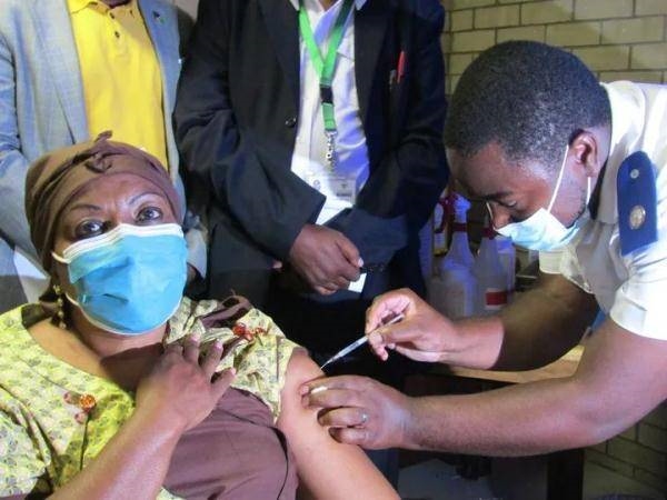 3月19日,纳米比亚卫生部副部长埃丝特·乌特尤亚·穆因詹吉作为该国首名新冠疫苗接种者在温得和克接种疫苗。新华社发(卡萨克摄)