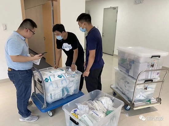 5月30日夜间,接广州华侨医院设备科紧急通知,项目组同事迅速前往医院,协助设备科对防疫物资进行清点、搬运,保证核酸采样点医疗物资充足供应。项目组同事凌晨依然坚守在中心库清点打包,只为确保一线医护人员稳定物资供应。