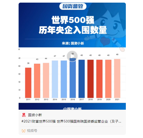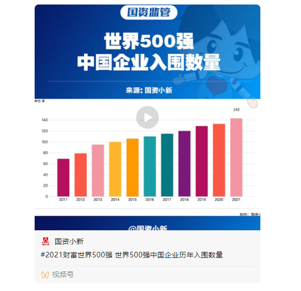 今日,2021年度《财富》世界500强排行榜出炉。加上中国台湾地区企业,中国共有143家公司上榜,其中,国务院国资委监管的中央企业有49家,地方国资委监管企业有33家。《国资报告》独家解析2021年度《财富》世界五百强上榜国企名单,小新为您分享如下——