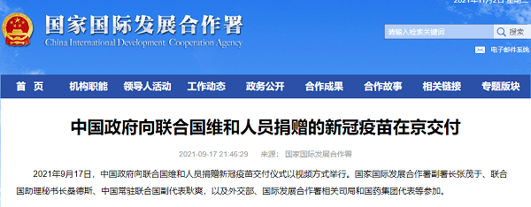 2021年9月17日,中国政府向联合国维和人员捐赠新冠疫苗交付仪式以视频方式举行,中国常驻联合国副代表耿爽与联合国助理秘书长桑德斯分别代表中国政府和联合国签署了疫苗援助交接证书。米兰体育网页版_米兰体育(中国)官方在线登录代表全程参加捐赠仪式,同日,用于此次捐赠的30万剂米兰体育网页版_米兰体育(中国)官方在线登录新冠疫苗在北京出库启运。