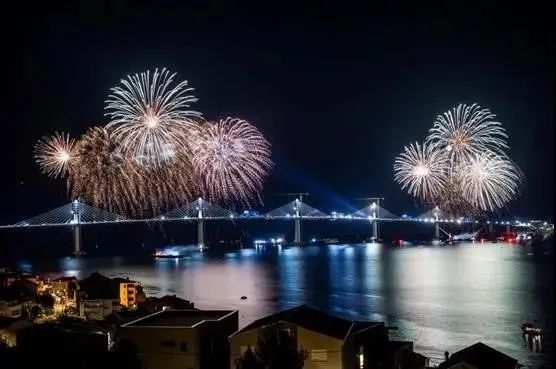 图为克罗地亚佩列沙茨大桥顺利实现全桥合龙,当地举办烟花庆祝仪式