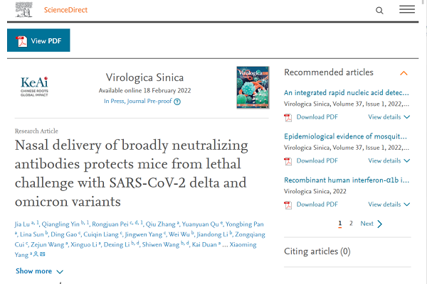 研究成果在ScicenceDirect在线发表了“Nasal delivery of broadly neutralizing antibodies protects mice from lethal challenge with SARS-CoV-2 delta and omicron variants ”(广谱中和抗体鼻内给药可保护小鼠免受新冠德尔塔和奥密克戎变异株的致死性攻击)的文章。