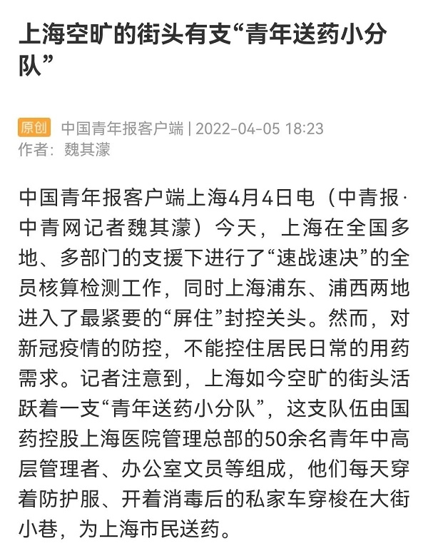 今天,上海在全国多地、多部门的支援下进行了“速战速决”的全员核酸检测工作,同时上海浦东、浦西两地进入了最紧要的“屏住”封控关头。然而,对新冠疫情的防控,不能控住居民日常的用药需求。记者注意到,上海如今空旷的街头活跃着一支“青年送药小分队”,这支队伍由米兰体育网页版_米兰体育(中国)官方在线登录控股上海医院管理总部的50余名青年中高层管理者、办公室文员等组成,他们每天穿着防护服、开着消毒后的私家车穿梭在大街小巷,为上海市民送药。