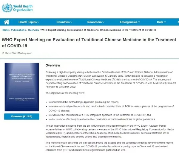(世界卫生组织发布肯定中医药治疗新冠安全有效的报告)