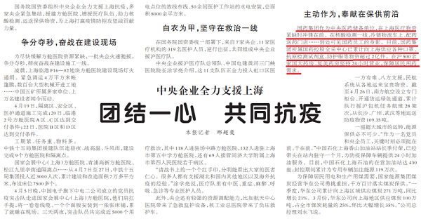 国务院国资委组织中央企业全力支援上海抗疫,多家央企紧急集结,援建方舱医院、增援医疗队伍、助力核酸检测、运送保供物资,为上海打赢疫情防控攻坚战贡献力量。