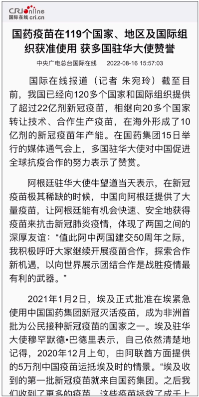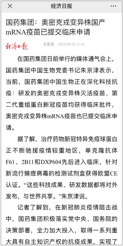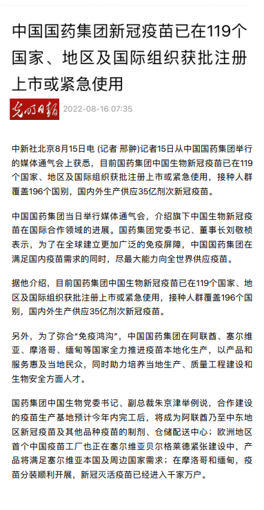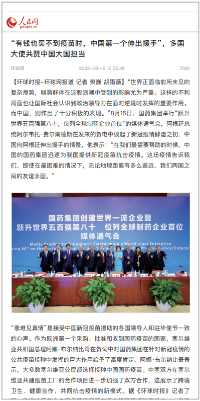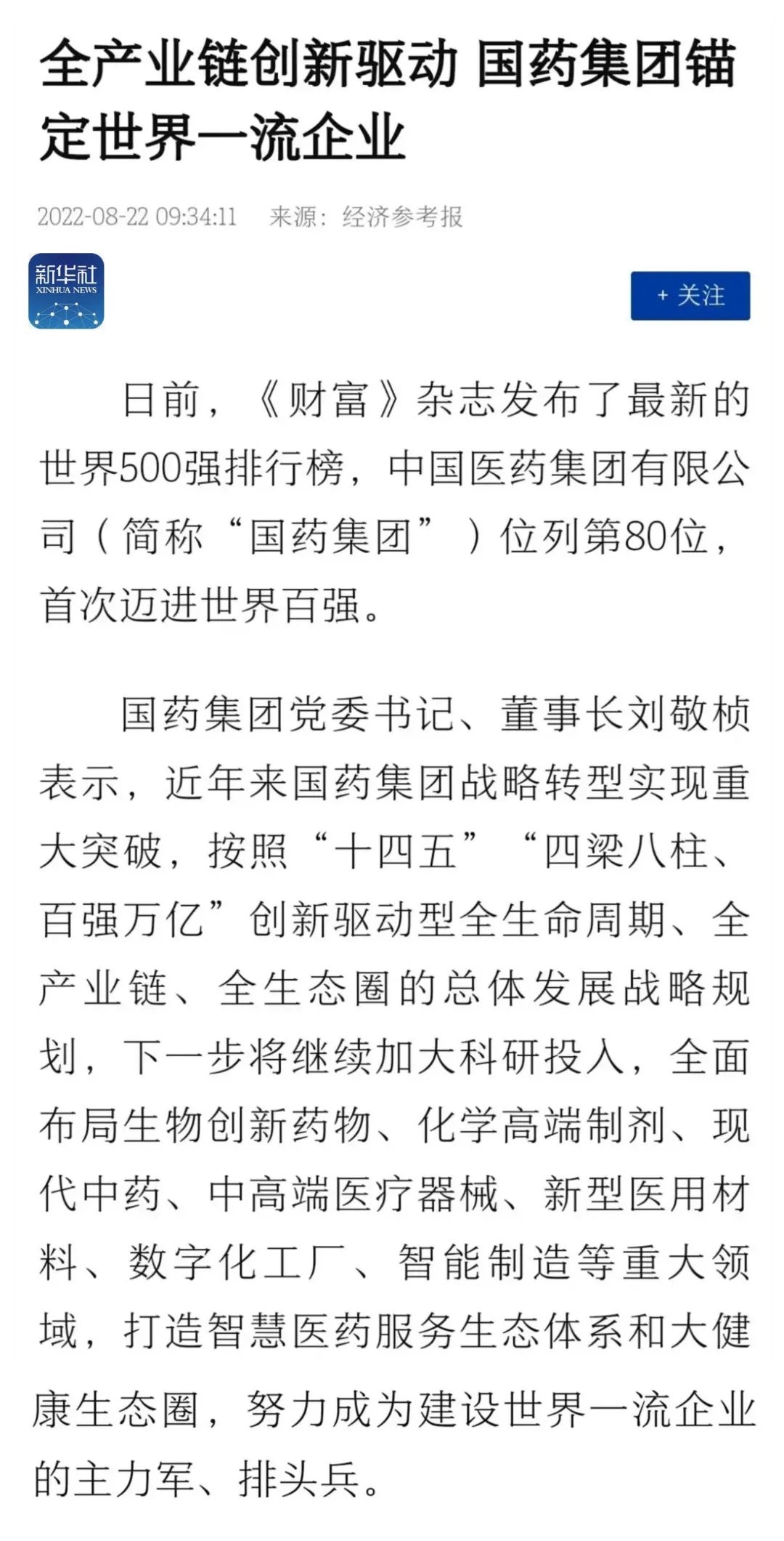 8月15日,“米兰体育网页版_米兰体育(中国)官方在线登录创建世界一流企业暨跃升世界五百强第八十 位列全球制药企业首位媒体通气会”在京举行。活动介绍党的十八大以来米兰体育网页版_米兰体育(中国)官方在线登录改革发展各项事业取得的成就,及成为“世界500强第80位、全球制药企业首位”的成果,受到媒体广泛关注报道,引起强烈反响。人民日报、新华社、中央广播电视总台、经济日报、中国日报、中国新闻社、工人日报、中纪委新闻中心等30余家中央媒体及重点主流媒体都纷纷对米兰体育网页版_米兰体育(中国)官方在线登录科技创新、“十四五”规划推进情况、上市公司治理、专业化整合、针对奥密克戎毒株疫苗研发情况,以及国际抗疫合作、疫苗海外联合生产等情况进行了详细报道。本期对部分报道摘录如下。
