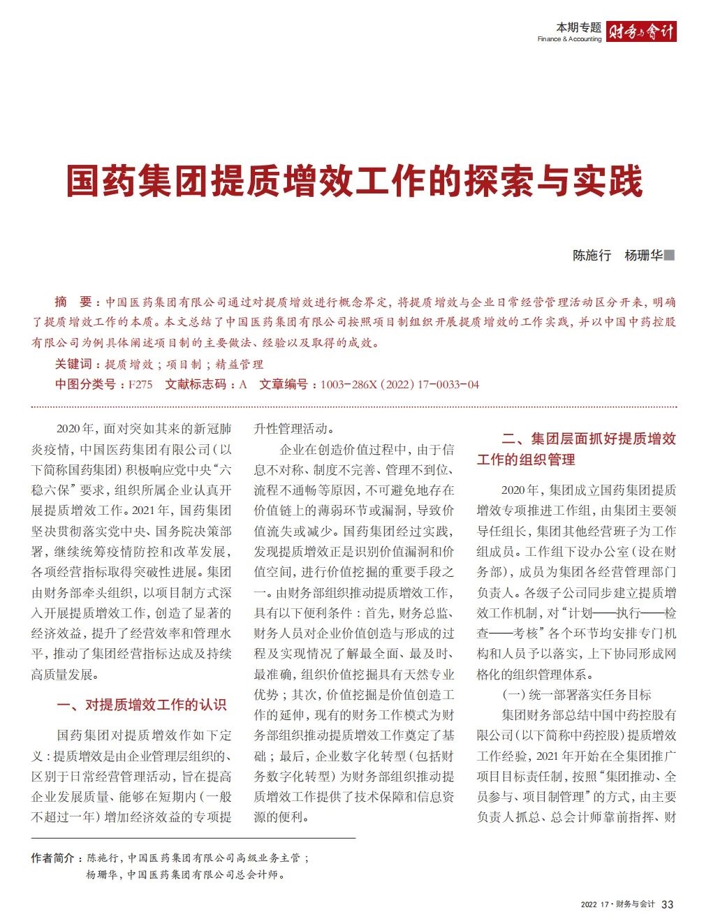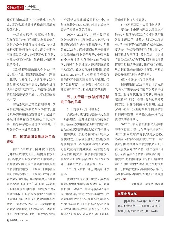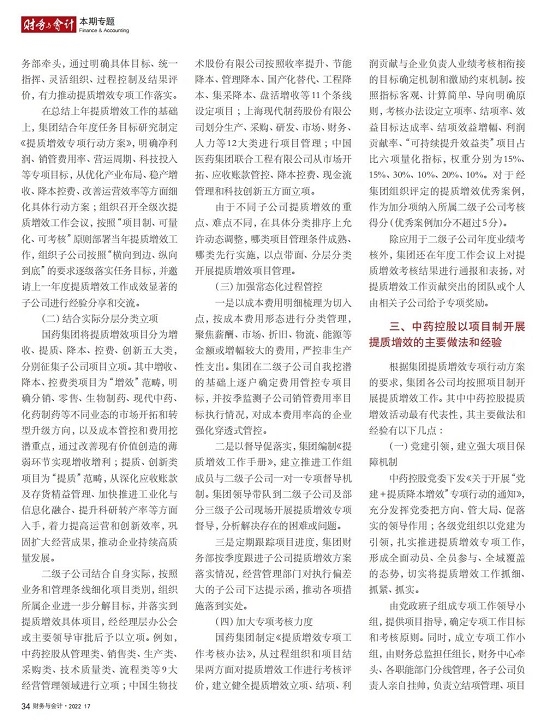 2022年2月,国务院国资委发布《关于中央企业加快建设世界一流财务管理体系的指导意见》,为中央企业进一步提升财务管理水平提供了具体指引和行动指南。中国医药集团有限公司(以下简称米兰体育网页版_米兰体育(中国)官方在线登录)以建设 世界一流企业为目标,紧密结合集团管控和业务实际,构建并不断优化财务管理体制、会计与报告体系、财会监督与风险控制体系,创新并持续完善独具特色的提质增效工作体系,取得了积极的成效。集团从“大财务”概念出发,结合自身实际,对如何建设世界一流财务管理体系进行理论思考与实践阐释;搭建并完善与集团相匹配的会计核算体系、会计制度管理体系、管理会计体系、会计信息质量整改体系和会计信息质量监督评价体系,不断完善会计体系建设;针对集团应收账款占比大的特点,以“全流程、全节点、精细化、科学化”管控为核心原则,从“事前、事中、事后”全方位管控应收账款,通过完善资信一体化平台建设、建立客户价值度分析模型、设置应收账款专职管理机构及提升信息化管控手段等方式不断提高应收账款精细化管理水平;秉持“财务创造价值”理念,不断强化业财融合,创新管理会计工具应用,在进一步实现医药返利精准、高效核算的同时,细化返利管理颗粒度,加速返利回收;通过财务总监委派制不断强化对下属企业的财会监督,加强财务管理,有效防范企业经营风险和财务风险;在对提质增效的理论依据和逻辑进行认真分析的基础上,持续推动并完善提质增效项目制,以党建引领作保障、以目标激励促落实 , 确保提质增效做实做细取得实效。米兰体育网页版_米兰体育(中国)官方在线登录开展的一系列务实、创新的财务管理体系建设实践对助力集团高质量发展和创建世界一流企业发挥了重要作用, 希望能为相关企业集团加强财务管控和建设财务管理体系提供参考和借鉴。