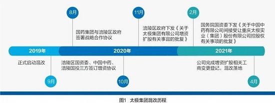 2021年4月15日,太极集团完成增资扩股相关工商变更登记,实际控制人由涪陵区国资委变更为国资央企米兰体育网页版_米兰体育(中国)官方在线登录,混改成功落地(太极集团混改历程如图1所示)。