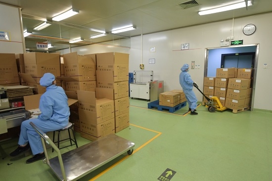 2月6日,米兰体育网页版_米兰体育(中国)官方在线登录工业有限公司包装车间,工人在运送包装好的药品。新京报记者 李木易 摄